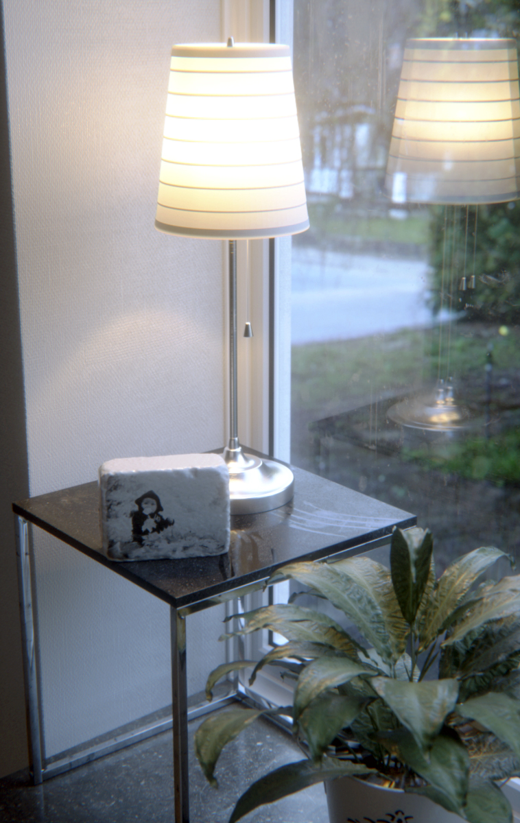 Aqui debajo, le bajé la influencia de la mascara del canal reflexión, se parece más aun a tu render, sobre todo si observamos la reflexión de la lámpara, tal parece que tu material de la mesa no tuviera la reflexión tan enmascarada.