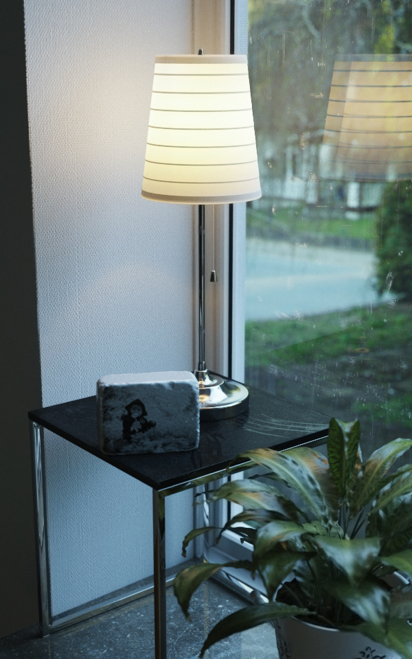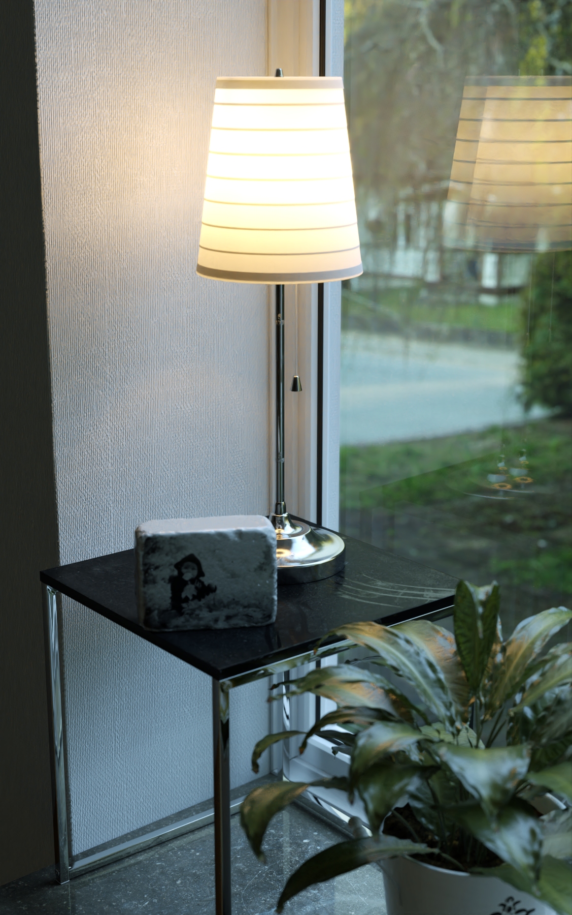 Y entre la HDRI, más ese material emisivo, ambas luminosidades no superan a la luz interior de la lámpara, es decir, que cuando la cámara apunta al exterior por la ventana, el control de exposición se abre aún más, pues afuera está más oscuro, y los marcos de las ventanas se incendian por dentro.