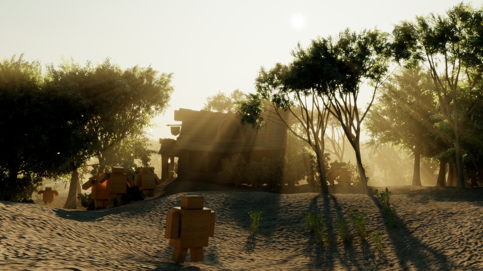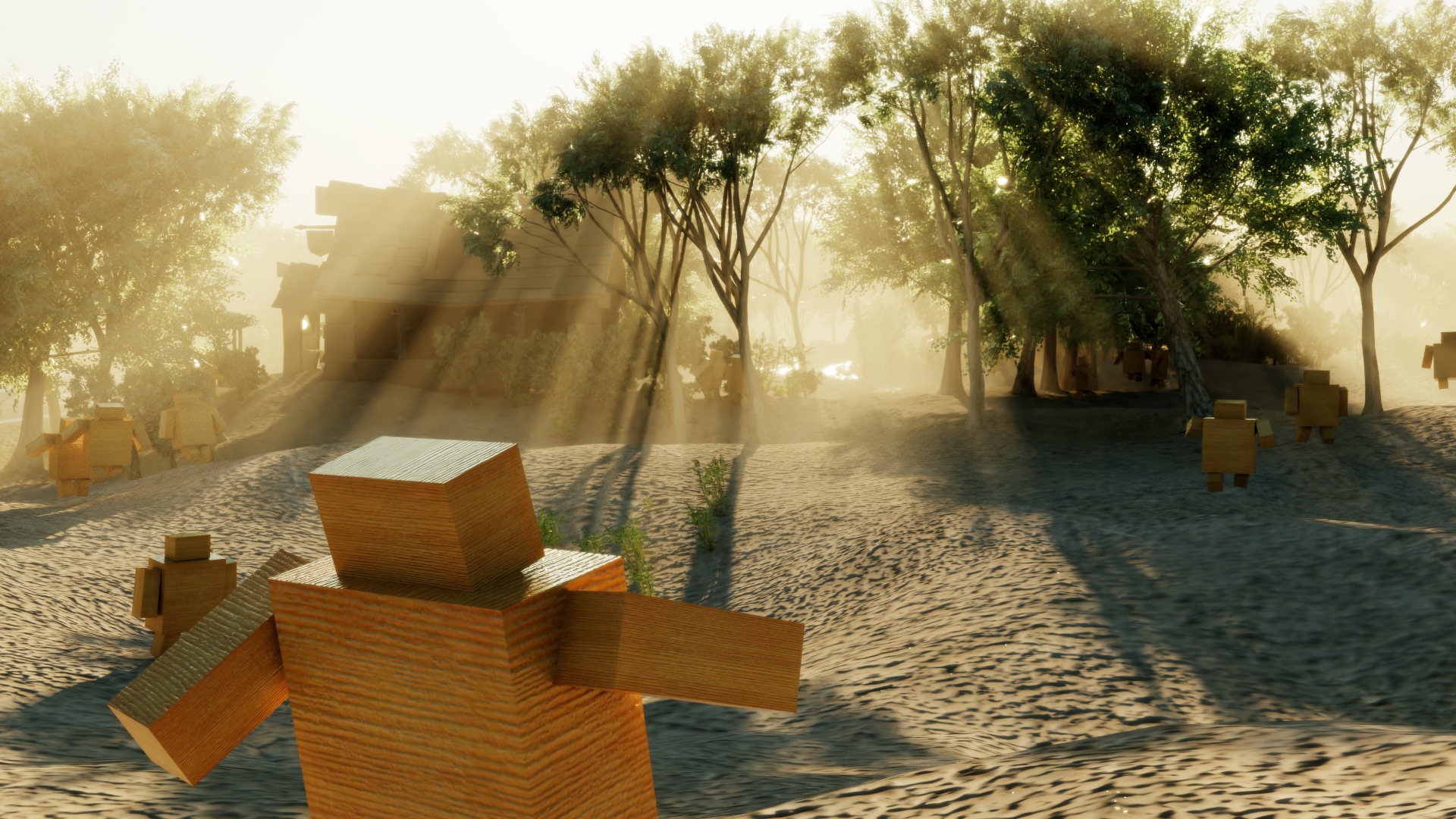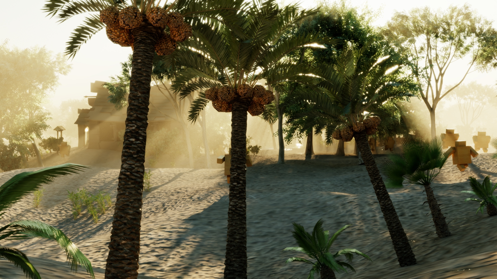 La velocidad de render para estas escenas es brutal, teniendo en cuenta que esa vegetación, toda hoja posee mapa de transparencia. Hay miles y miles de etapas de transparencias superpuestas para que la luz pueda atravesar y llegar definitivamente al suelo. Cada etapa está siendo tenida en cuenta en la voxelización de la niebla volumétrica.