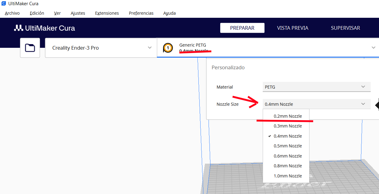 Buen día, estoy teniendo un problema. Estoy imprimiendo perfectamente con boquilla de 0.4 mm. El inconveniente es que ahora necesito imprimir algo con más detalle y más pequeño, así que compré una boquilla de 0.2 mm, pero el