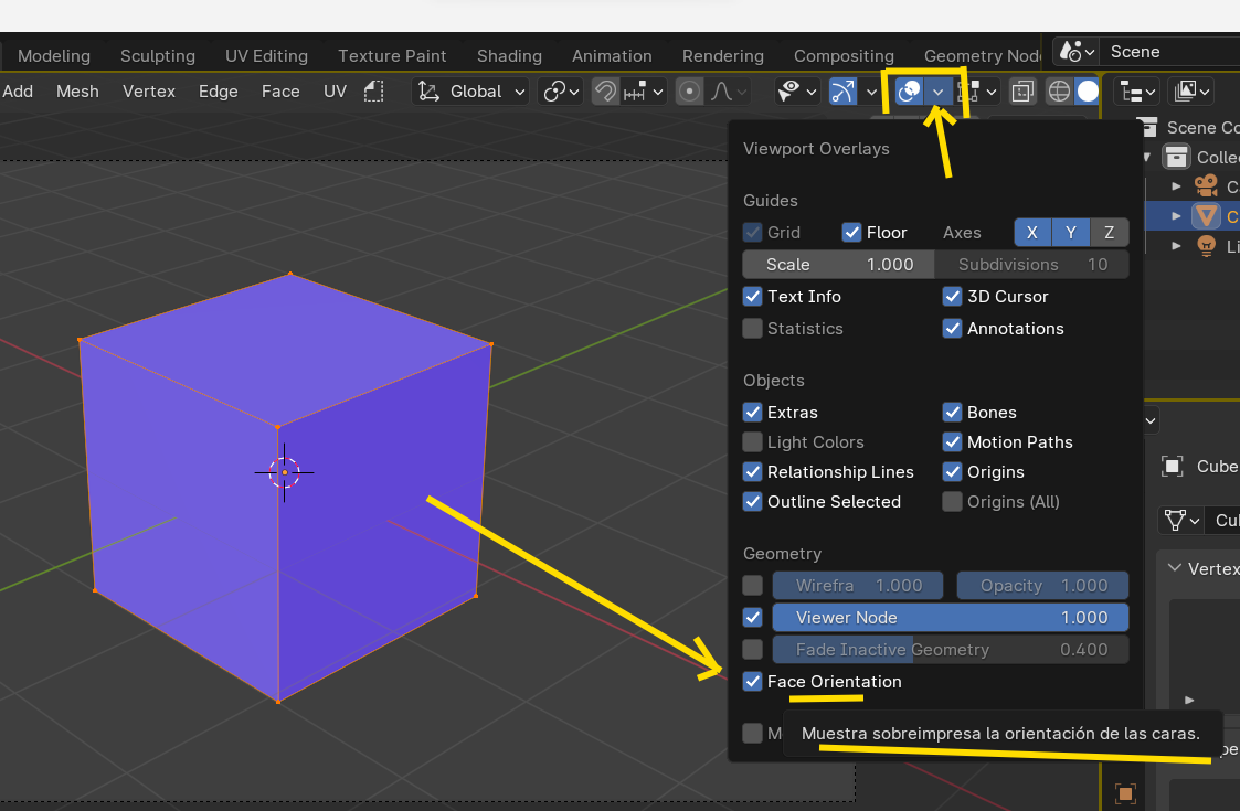 Para ver visualmente si está bien el modelo, se activa la casilla de "Face Orientation" y las caras que apunten hacia fuera del modelo se verán azules y las que estén invertidas se verán de color rojo.