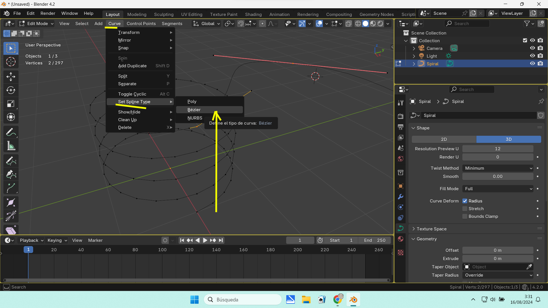 Convierte la espiral a Bezier desde Modo Edición - Curve > Set Spline Type