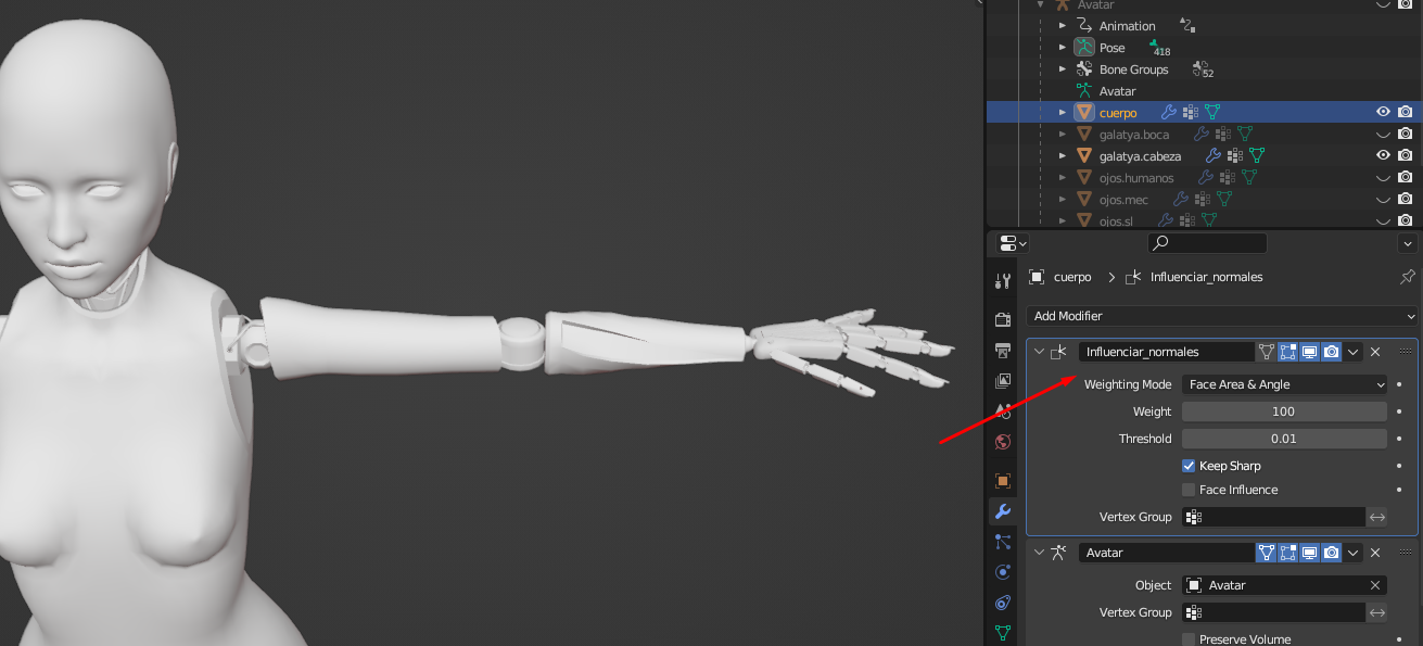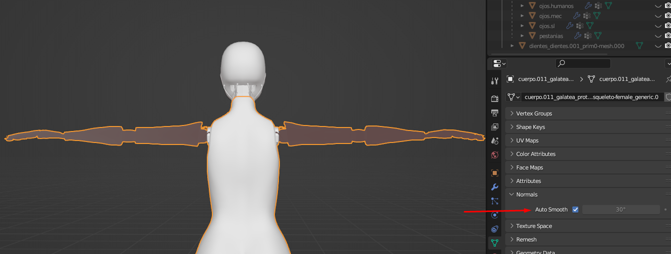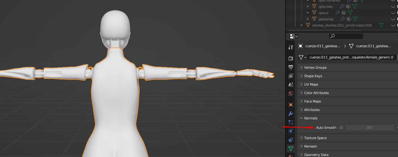 Estoy teniendo problemas en varias partes del personaje y no sé qué es. Este sombreado extraño aparece cuando activo el Auto Smooth en cualquier grado. La malla tiene las normales correctas y no tiene vértices dobles. No sé si ocurrió al darle materiales, pero las borré todas a ver si era eso y la malla sigue con el mismo problema. También probé con todas las luces de Studio y Matcap. Probé cambiando los hdris; sin embargo parece que el problema está en la malla.