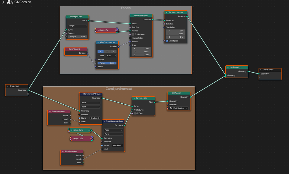 En el otro marco se distribuyen los fanales a lo largo de la misma curva Bézier. Obviamente, se colocan sobre la curva, por lo que quedarían centrados en el camino. Para desplazarlos perpendicularmente al eje del camino, los oriento con el nodo Curve Tangent y después los desplazo con el nodo Translate Instances. Seguramente con el nodo Normal también funcionaría, pero no lo he probado.