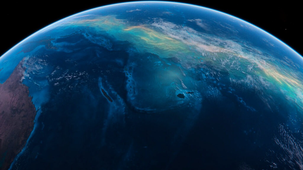 Cada episodio se enfoca en un océano, mostrando sus características únicas mediante simulaciones basadas en datos de la NASA y colaboraciones con oceanógrafos. Moonraker VFX creó estas simulaciones en Houdini, diseñando cámaras dinámicas en 3D para un enfoque inmersivo. También trabajaron en un distintivo título de apertura que centra la narrativa en los océanos, destacando sus corrientes y temperaturas para conectar visualmente al público con la historia científica.