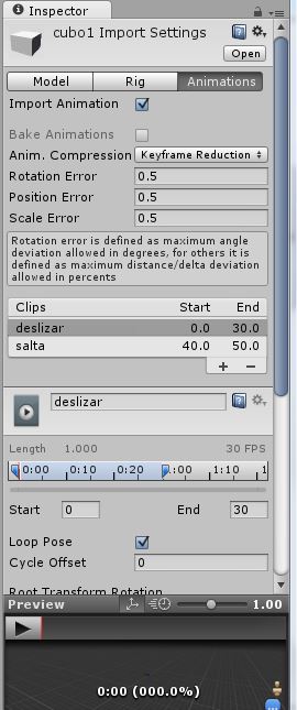 [LIST][*]Selecciona el FBX en el panel de Project.[*]Ve a la pestaña Rig y asegúrate de que el tipo de animación esté correcto (por ejemplo, Generic o Humanoid si aplica).[*]En la pestaña Animation, define los clips correctamente:[*]Añade dos clips, uno para deslizar (frames 0–30) y otro para salto (40–50).[*]Marca Loop Time si quieres que alguno se repita.[*]Dale nombres claros a los clips: Slide y Jump, por ejemplo.[/LIST