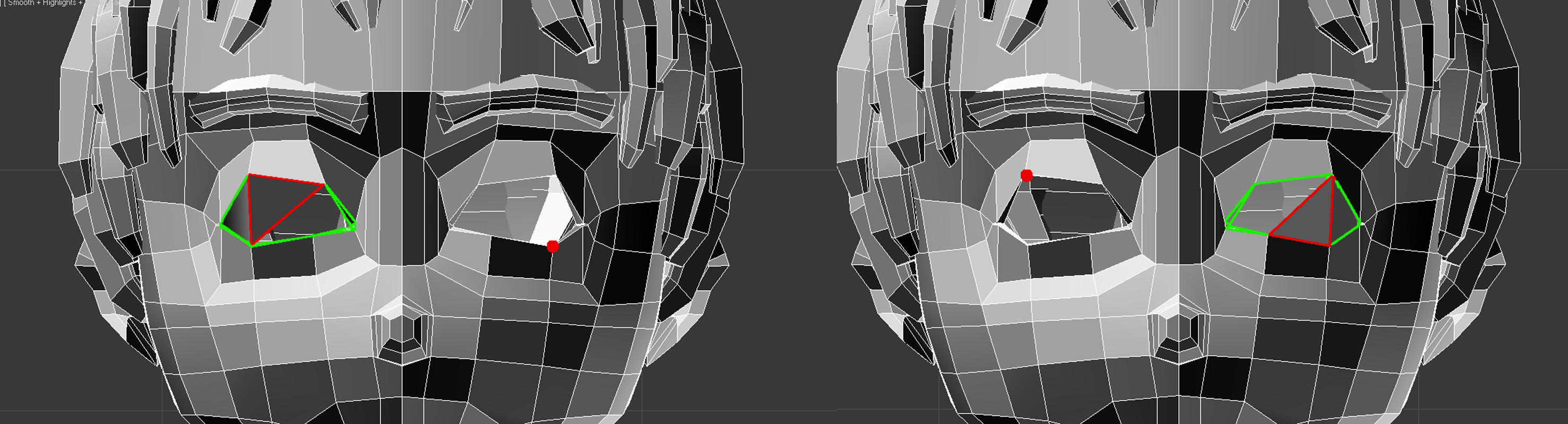 Veréis que la cabeza izquierda tiene hecho el mirror de derecha a izquierda. El punto rojo corresponde al vértice el cual hago el mirror y como veréis el vértice del otro ojo se desplaza hacia abajo, cuando debería quedarse arriba. La otra cabeza sigue exactamente el mismo proceso, pero con el mirror de izquierda a derecha. De igual modo los vértices parecen entrecruzados.