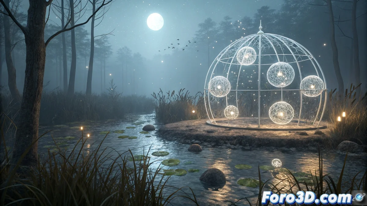 Una animación en After Effects de luces fantasma flotando de manera errática sobre un pantano o humedal, con un resplandor etéreo que evoca la misteriosa presencia de los will-o’-the-wisps en la tradición y la naturaleza.