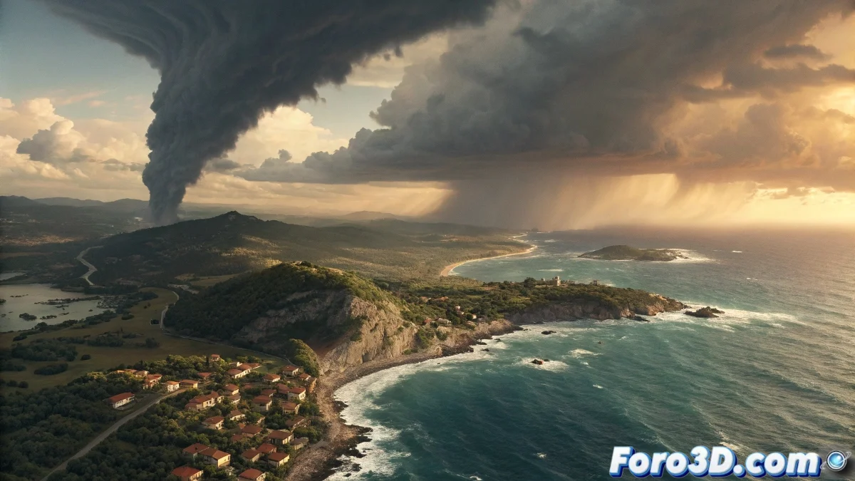 La iluminación y las sombras se ajustan para dar dramatismo, destacando la severidad del fenómeno, mientras se añaden texturas de nubes y agua que refuercen la sensación de realismo y urgencia.