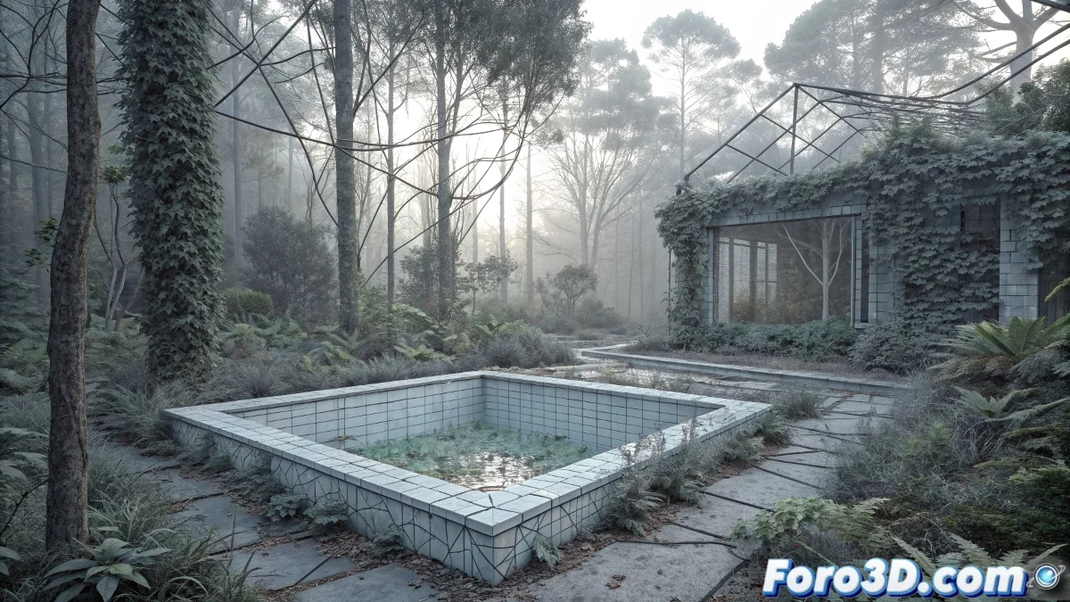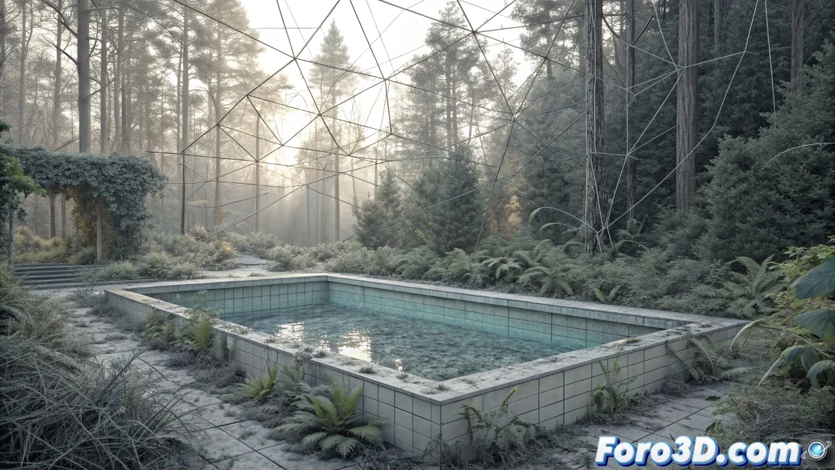 Recreación de las piscinas naturales abandonadas en el Montseny, Barcelona, un lugar envuelto en misterios y sucesos paranormales. La escena busca transmitir desolación, vegetación invasiva y un ambiente húmedo y nebuloso, combinando modelado, iluminación dramática y efectos ambientales.