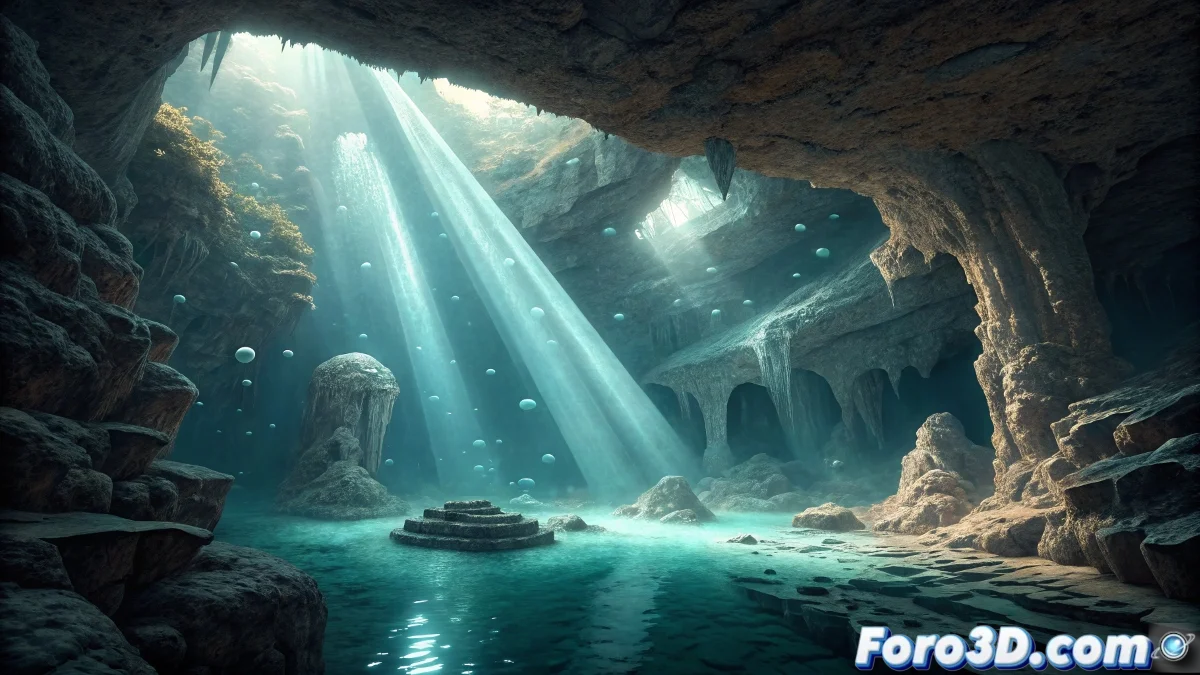 Inicia configurando la escena base con geometría de cuevas usando herramientas de modelado poligonal, creando formas orgánicas mediante deformadores y escultura digital. Establece la iluminación ambiental simulando los rayos de sol que penetran desde la superficie, utilizando luces de área y volumétricas para recrear el característico efecto de haz luminoso en el agua. Ajusta los materiales con shaders que combinen transparencia, refracción y reflexión para el agua, junto con texturas de roca caliza con mapas de normales y desplazamiento.