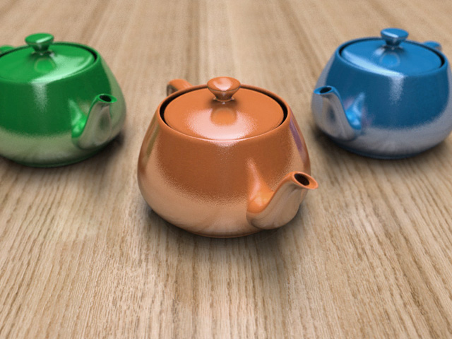 Podría alguien simular esta imagen con el Mental Ray del 3ds Max 7, es por simple curiosidad, la imagen es bien sencilla, tres teteras, una sola luz, nada de HDRI, suelo de madera, Mental Ray 2.1 standalone.