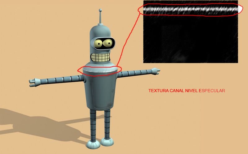 Hola, aquí os cuelgo un trabajo en proceso con max de un personaje al que todos conocéis, me gustaría vuestra opinión y preguntar una duda que tengo que es aplicable a todo el modelo, pero que voy a centrar en la carcasa. El Bender por ahora no tiene ningún sombreador metal, sólo anisotrópico, mi duda es en la arista superior de la carcasa. Le añadí un material blanco y negro en el canal de nivel especular para simular rayones en la carcasa por efecto del desgaste, pero en vez de parecer que brilla cuando le incide la luz, más bien parece que está manchado, como si fuese colocado en el canal difuso, además hice una animación con luces y no me satisfiso el resultado, también he hecho un material mezcla con metal y anisostrópico, pero el material metal oscurece demasiado el modelo (aún no se usarlo).