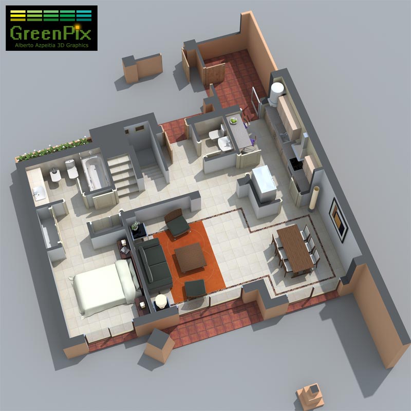 Modelados en 3ds Max 6 a partir de los planos de Cad. El mobiliario y demás es de librerías (e-interiors, roca, Dosch etc), con los materiales míos. Renderizado con Vray, cada render a resolución final (2500 por 2500) tardo unas 2 horas.
