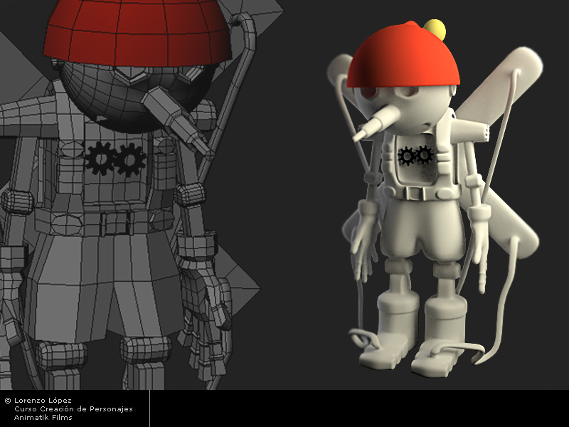 Buenas pelado, el personaje está bien, un poco soso para mí gusto, pero bien, intentaría meterle más caña en algunas cosas, como en el gorro de la cabeza, las manos y en las piernas, también esos engranajes que tiene en el pecho se ven muy desolados, si quieres que parezca maquinaria, le metes algo más, y que parezca más profundo, se queda muy en la superficie.