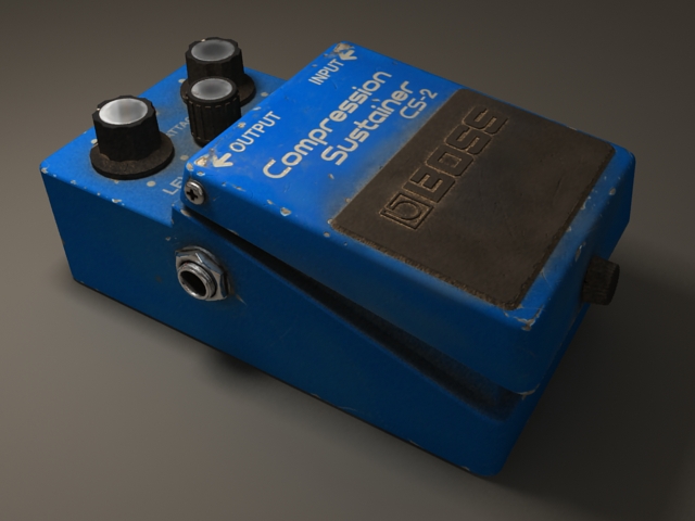Como voy a tardar un huevo me voy a divertir aún más y sé que me va a vaya cuando acabe, he empezado esta semana que acaba y estoy usando max7 y Vray con irradiance en primarios y Light Caché en secundarios, el primer objeto es un pedal compresor CS2 (el mejor que ha habido y habrá) todo el pedal es un solo objeto y un solo material con los correspondientes mapas de color, Bump, especularidad y máscara de reflexión.