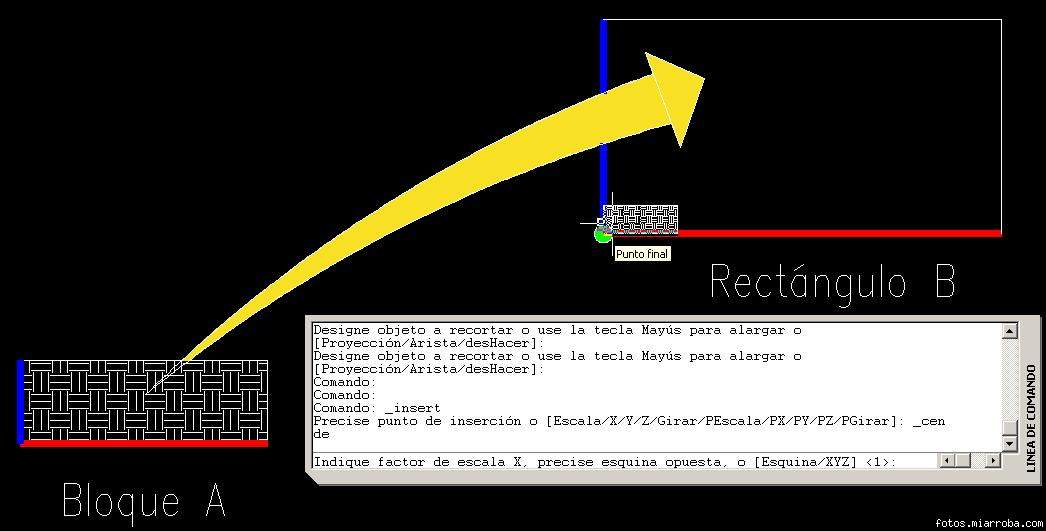 Pero según me han dicho en el AutoCAD 2006 ya es automático esto. Haces lo mismo: te metes en el cuadro de diálogo de propiedades del bloque y te vas a la pestaña de escala x e y, y pinchando sobre las aristas el solo te hace la proporción sin necesidad de coger la calculadora. Pero esto me lo han comentadol, yo aún no he visto el AutoCAD 2006.