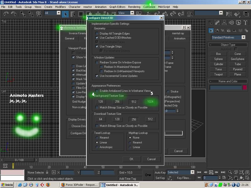 5º aumenta el valor de background texture size ponla al máximo 1024 y ya está. Saludos, (en esta guía no se han maltratado a animales, los números no corresponden a los pasos del texto, pero dan seriedad).