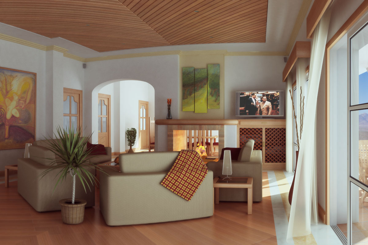 Lo que no están tan bien: la chimenea (la textura), el fuego, la celosía (muy oscura esa madera), la tele (ya te lo han dicho que es un canteo), la cortina (parece de plástico), los sofás (parecen de goma), la manta (demasiado definida la textura y parece que esté almidonada).