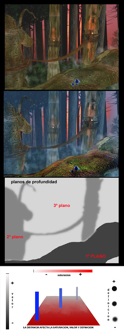 De ahí que aisle el tronco en primer plano y acerque los valores y aumente la saturación en algunas zonas ya que, al estar cerca el valor es más contrastante y los colores más saturados por percibir los puntos de color sin interferencias(menos densidad de aire, veladuras de luces, etc), todo esto más o menos proporcionalmente y también le di algo de enfoque para alcanzar más nitidez porque al estar más cerca puedes ver más detalle que en un objeto lejano, luego separe el segundo plano donde disminuí la saturación y valores, y el tercer plano más desaturado aún donde quite bastante definición con un blur (desenfoque) y eso ayudo mucho a despegar los planos y así tener jerarquías en cuestiones de importancia para el observador, es decir para manipular la vista del observador y llevarla a donde se desarrollara la acción, hacia donde la cámara enfoca.