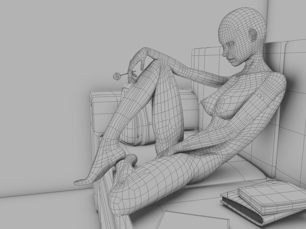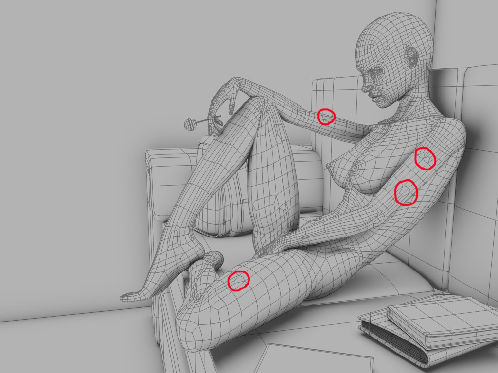 Vas bien emo, pero hay cosas que no me gustan, como, por ejemplo, que los glúteos estén tan unidos y los pechos a los costados tienen una arruga donde se supone que van lisos, o me equivoco, no logro distinguir bien porque es wire¿podrías adjuntar un render sin wire (mejor si es de mucha resolución)? No logro ver bien, pero al parecer la tibia y el, peroné no hacen la curva correcta al empezar desde la rodilla y los pies los veo demasiado extraños. Un saludo.