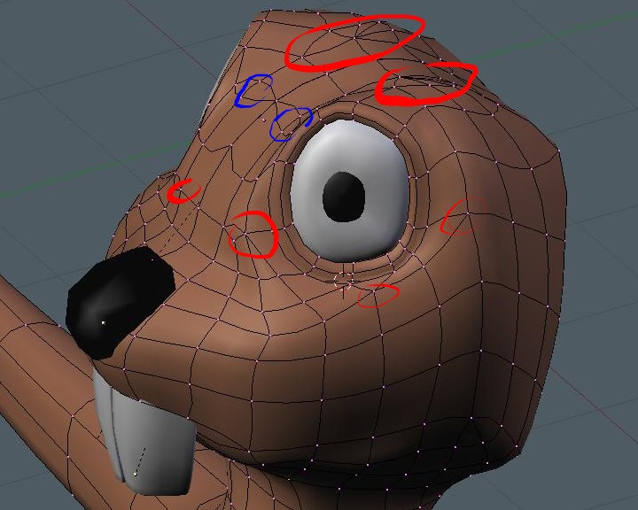 Si es un modelo viejo, yo empezaría de nuevo, porque normalmente es más fácil que corregir errores anteriores. En tu modelo hay muchas aristas que convergen en el mismo vértice (marcado en rojo) y geometría que sobra y podrías evitar simplemente uniendo vértices (marcado en azul).
