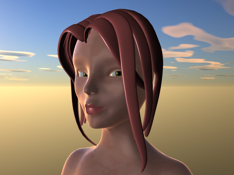 Interesante forma de solucionar el pelo, me gusta, con una buena textura puede quedar muy interesante. Es intencionada que no tenga las líneas de los ojos y los párpados, eso haría que no pareciese tan virtual, pero no sé, porque parece que también quieres darle toques mangas o así, entonces mejor sin ellos, yo de todas formas, le marcaría los párpados.