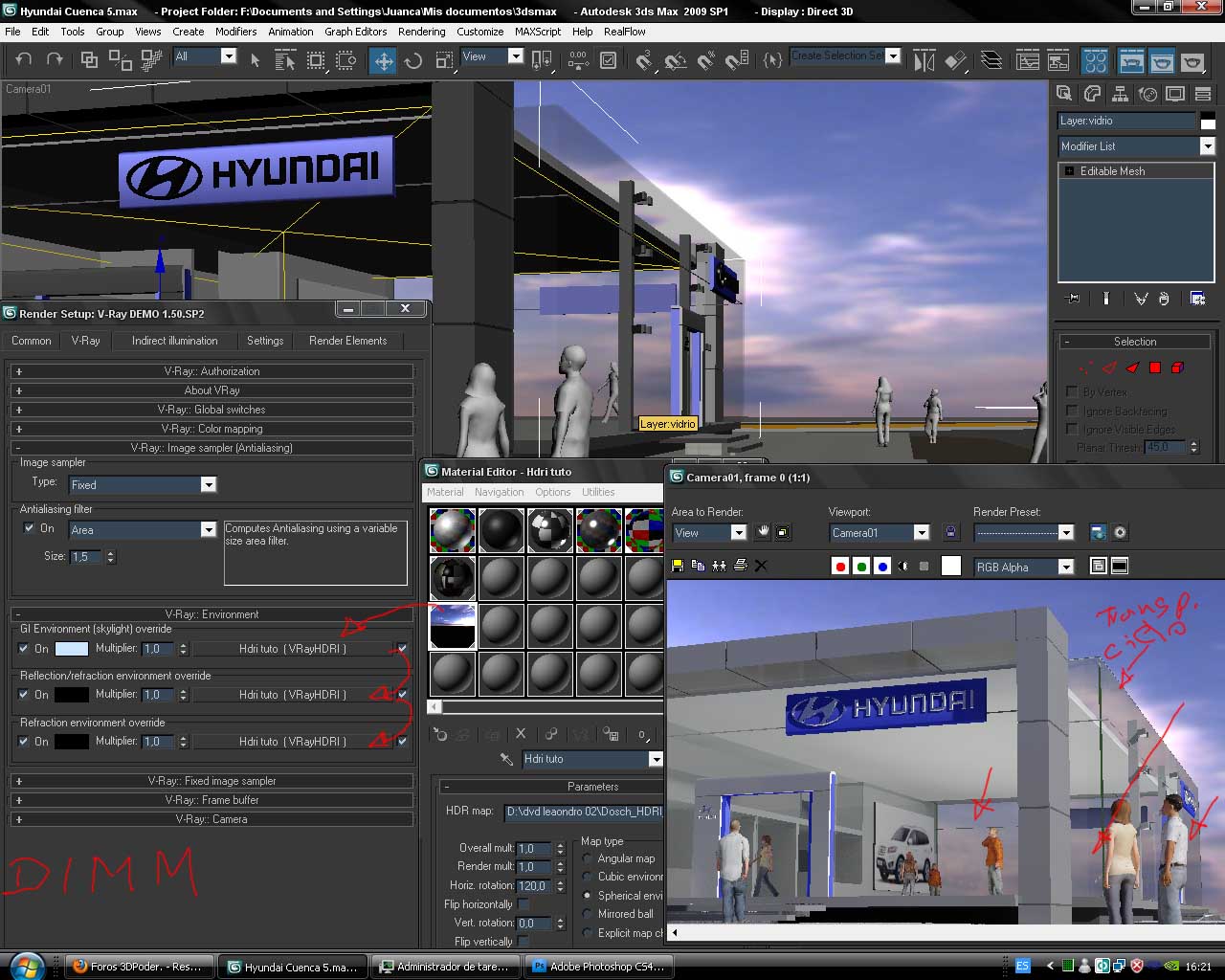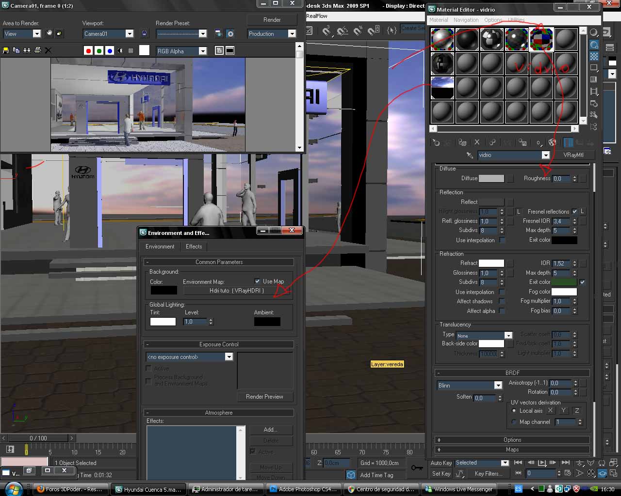 Pase largo tiempo con el problema de los cristales y el background antes, pero en este trabajo no podía obviarlos ya que la vista exige esto, bueno lo resolví usando materiales Vray, configurándolo de manera que, presionando la tecla 8 me aparezca el menú de environment and effects allí el mapa HDRI que utilizo lo clono hacia el visor de materiales en un slot hecho esto, también lo clono en las casillas de Vray environment en las tres esto es importante y allí esta la solución, ojalá les resuelva esto a algunas personas que les sirva. Suerte.
