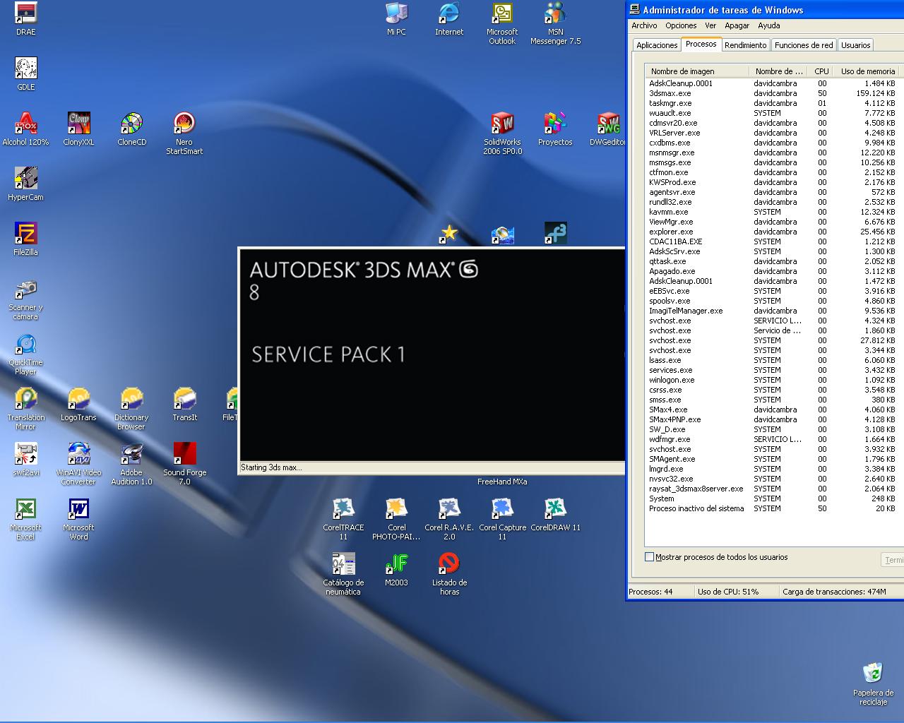 Hola, he ido a instalar el service pack 1 del 3ds Max 8 y después de instalarlo, max no se me abre. Simplemente se queda en la splash screen, y según el administrador de tareas se queda pillado al 90 y tantos por ciento de procesador. Uso Windows XP con el service pack 1. ¿Qué puede será. Un saludo.