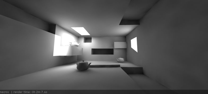 Solo hay un material blanco sin texturas, y el antialiasing está deshabilitado. De este modo, quiero analizar solo el GI, sin coste alguno sobre otros cálculos. Yo solo me voy a centrar en el FinalRender. Pero me gustaría, para completar este análisis, que alguien o algunos hagan las correspondientes pruebas en Vray y Brazil. De modo que colocare el archivo max para poder descargar.