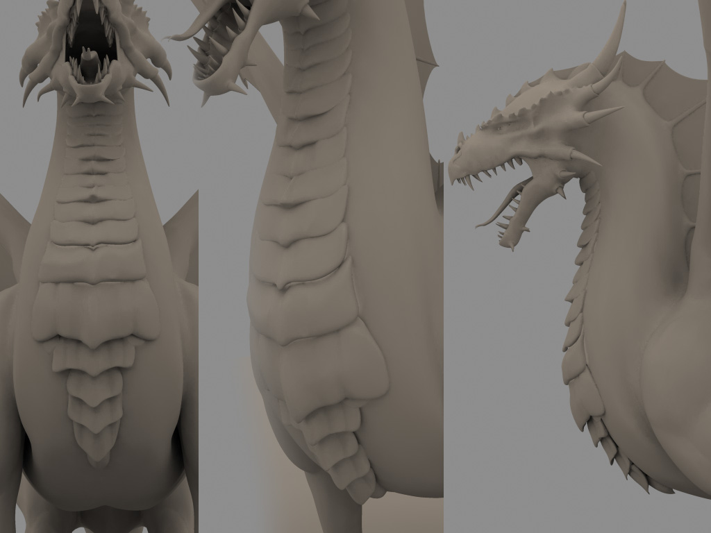 Está quedando muy bien. Y aunque no llego a ese nivel de modelado orgánico, creo que es muy cabezón, y para como son las patas delanteras, las traseras deberían ser un poco más grandes (o eso, o la perspectiva me engaña ô_o), la cresta del cuello no me acaba de gustar, creo que quedaría mejor más abajo, pero no mucho. Y, sí, le pondría un par de alas enormes (tampoco tienen por qué ser tipo murciélago) y la cola más larga.
