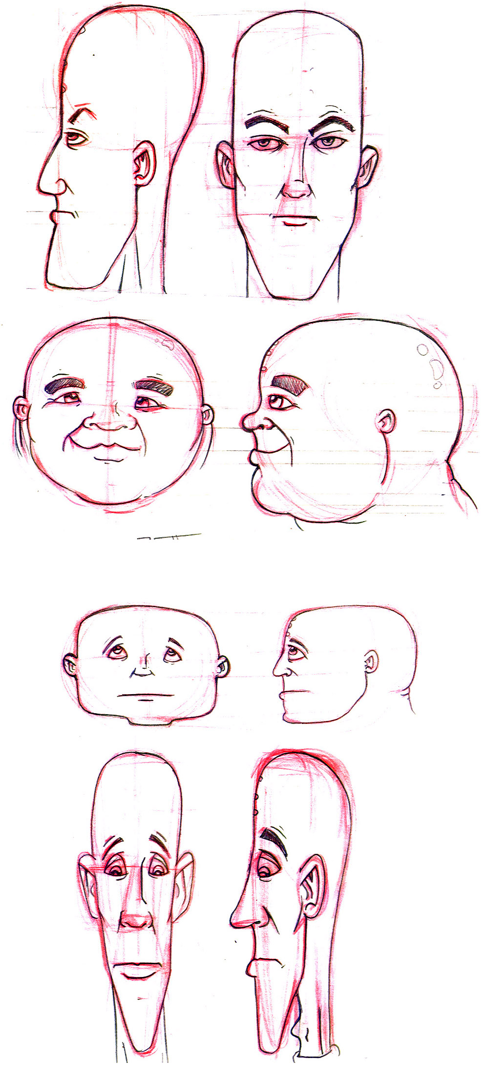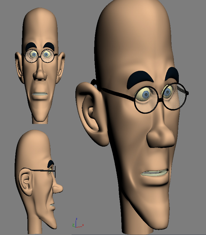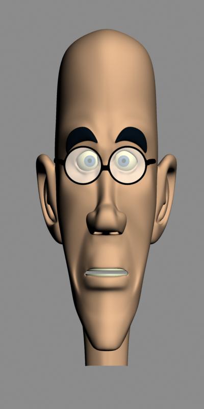 La forma de la cara me parece cojonuda, tiene mucha gracia el tío, lo que no me acaba de gustar es la nariz, sobre todo la punta, si te fijas en la imagen frontal que publicas se ve un poco cuadrada, pero a lo mejor esa era tu intención, aunque en los bocetos no se aprecie. Lo que tampoco me acaba de convencer es la oreja, en especial el extrude hacia fuera de los cartílagos interiores de ésta. Por supuesto un gran personaje para animar, sin entender mucho sobre esto los loop me parecen muy correctos para la animación facial.