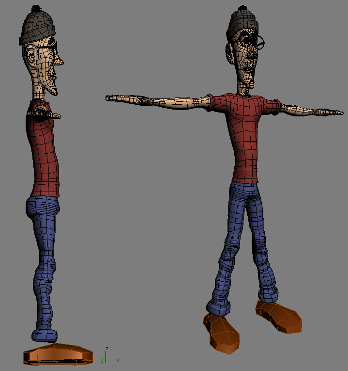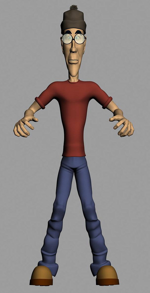 Hola cartoon 10. Te está quedando que de p**** madre el colega. El vestuario muy creativo. Pero. Trataré de no ser muy toca pelotas, para los personajes caricaturescos, por mi experiencia personal, cuanto más sencillos mejor. El cuerpo lo veo muy definido para el tipo de cara que has hecho, vamos que si le pones el tronco más poligonal en plan rectángulo y los brazos menos definidos yo creo que ganaría en expresividad y tendrías que trabajarlo menos, igual que con el pantanlón, que trabajándote tanto las arrugas hacen falta unas buenas texturas para darle verosimilitud. Con vistas a la animación está muy bien, buenos loops y eso, pero ya te digo cuanto más sencillo más podrás deformarlo, y ya me callo que por lo demás me parece cojonudo.