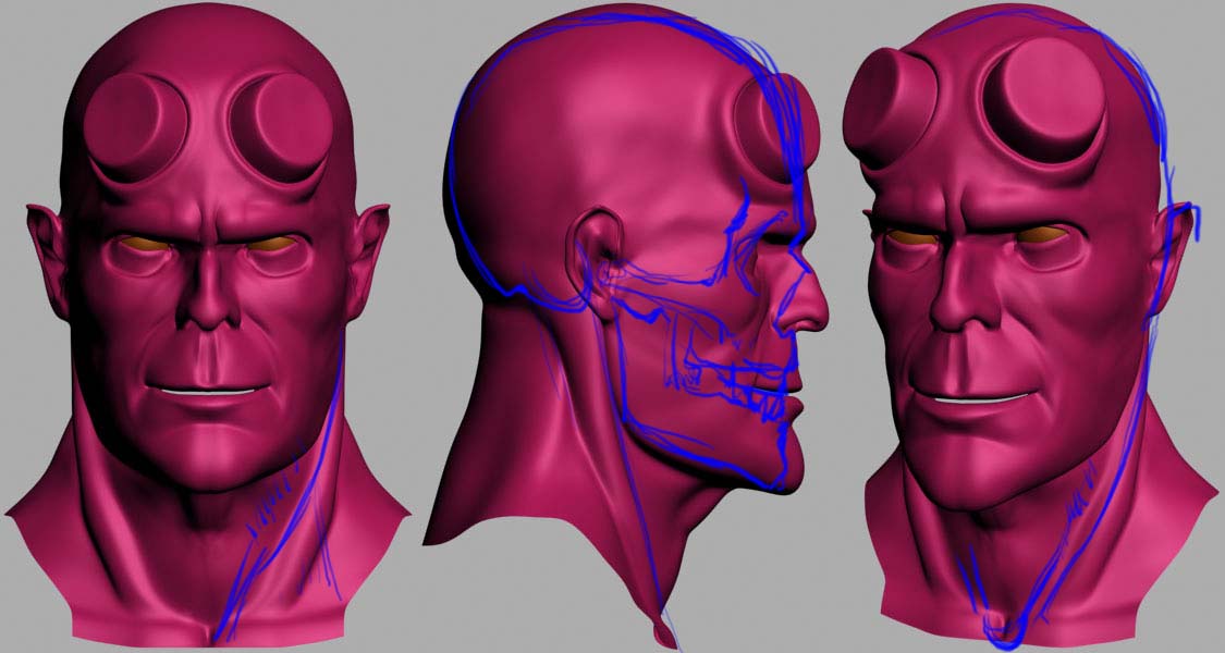 Me encanta Hellboy. La nariz y la boca perfectas, la mandíbula debería ser más ancha, la estas haciendo de lo que ves en la fotografía, pero no estas teniendo en cuenta que debajo ed las patillas también hay carne + fíjate de frente: