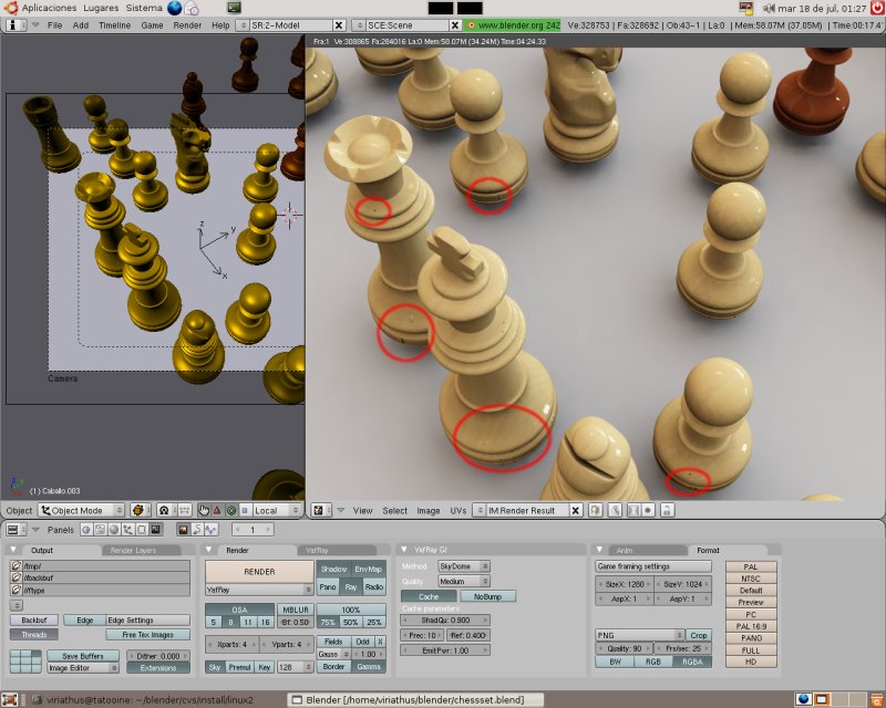 A probarlo, a ver si se arreglan los puntos negros que me estaban saliendo en la versión actual. Edito: la imagen de abajo es con Blender 2.42 (compilado con -mtune=Athlon 64) y Yafray 0.0.8 (paquete de Ubuntu x64).