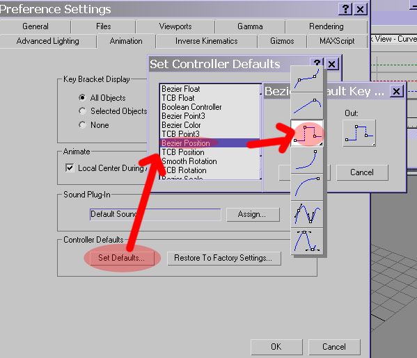 Tengo entendido que max no puede crear una clave de este tipo directamente, sino que hay que trastear con el editor de curvas de Track View, lo cual si manejamos muchas claves de muchas partes del cuerpo, se puede hacer ciertamente complejo. El truco consiste en decirle a max que las claves que cree sean, por defecto, de este tipo, stepped. ¿y eso dónde? Pues en la ventana preferencias, como indica la captura de debajo. Con esto evitamos que max intercale entre claves. Saludos.
