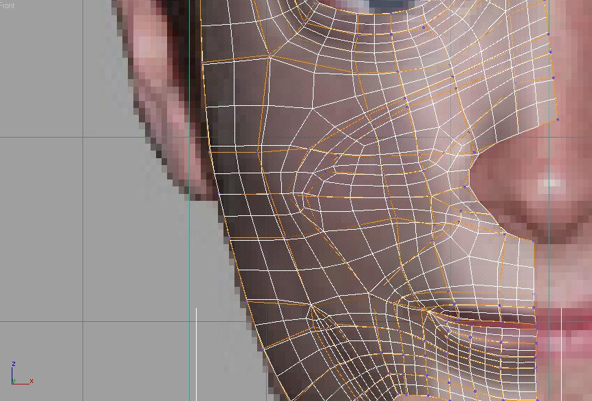 He intentado hacer loops con la herramienta cortar de 3ds Max. No sé si están correctos, ya que por mucha referencia que coja, creo que básicamente se tendrían que ajustar a la fisonomía del personaje en concreto. No obstante son unos loops un poco raros, ¿no?