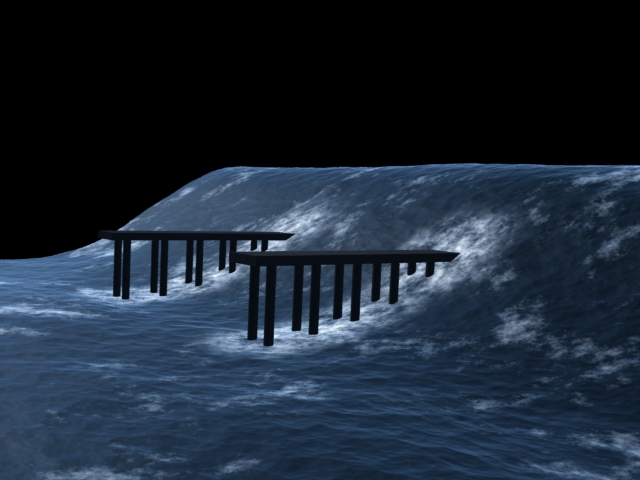 Aparte de lo que te han comentado, creo que mientras la ola se traga el muelle debería salpicar o algo, porque parece que para la ola el muelle es como si no estuviera. De todos modos, esta guapo.