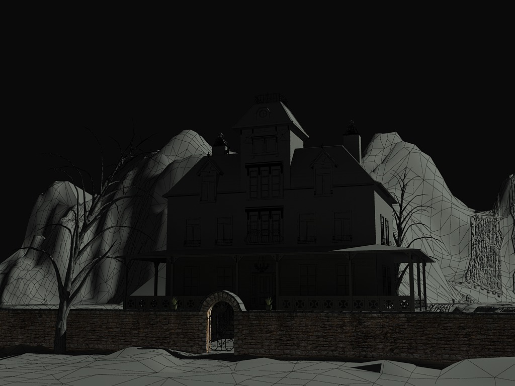 Vaya, yo creo que el cerro le resta protagonismo a la casa, que te parece si en lugar de ese cerro pones una especie de bosque con niebla con esos árboles secos.