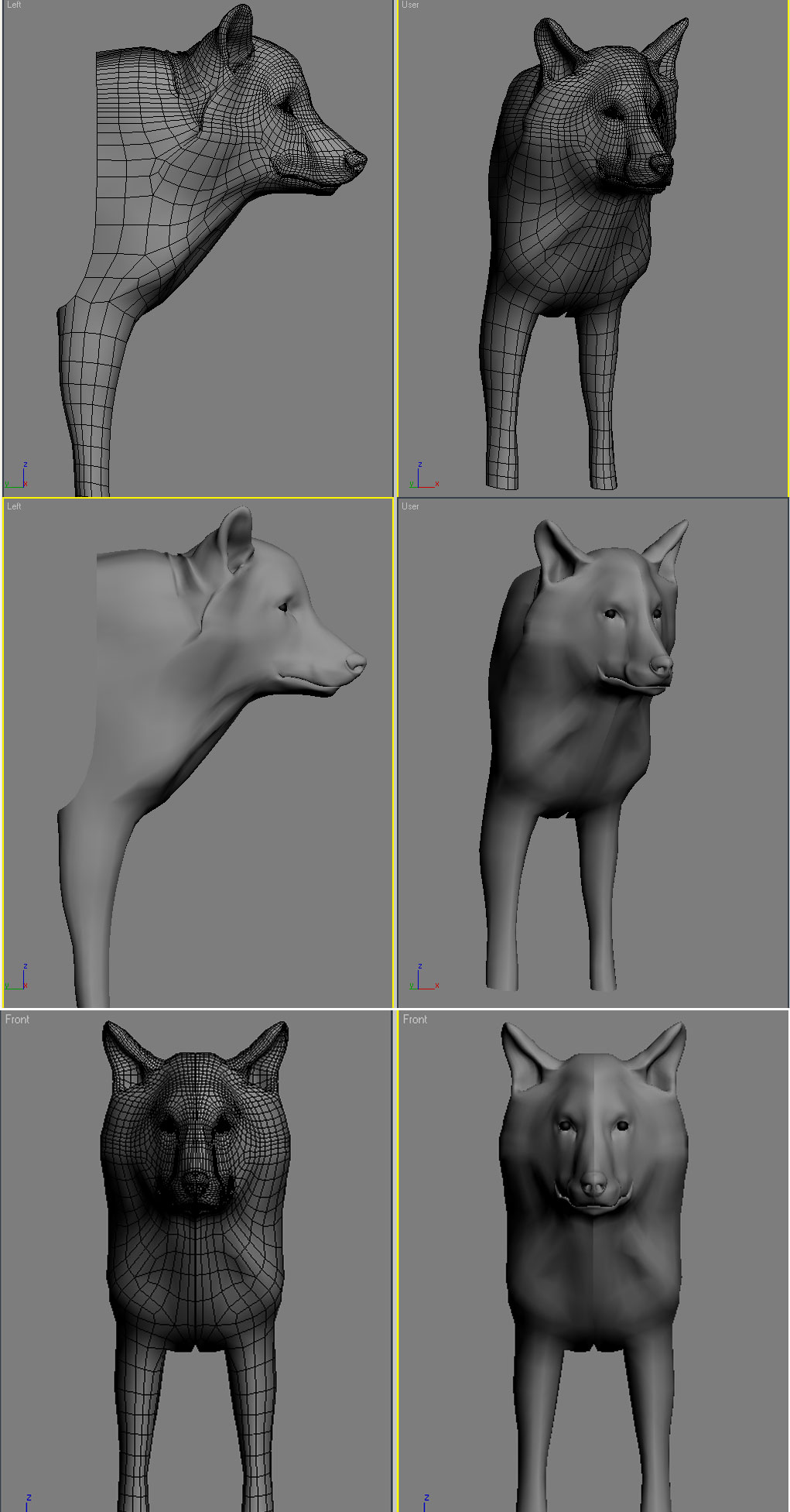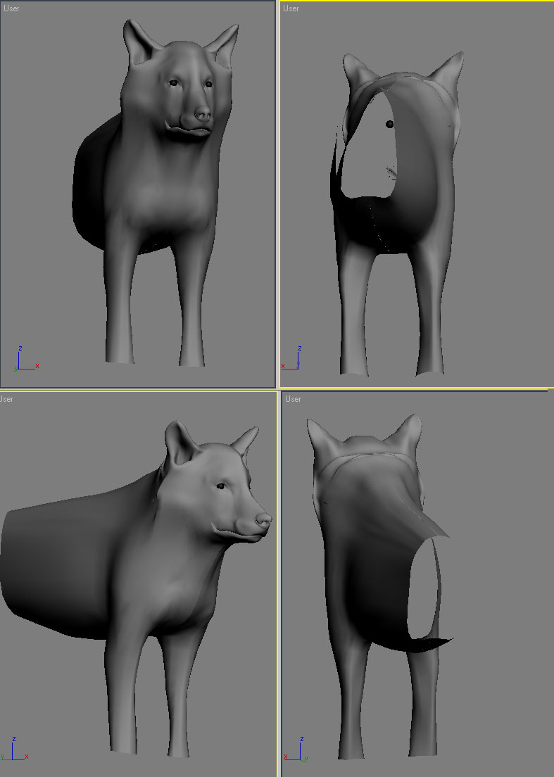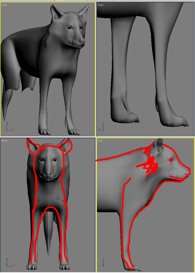 Agradezco cualquier comentario y sugerencia, el modelo pretende ser un lobo sin pretender ser un modelo hiperrealista, por exigencias del proyecto no se puede usar Fur o Hair de max así que, todo el pelo debe ser geometría y así es como lo estoy haciendo, gracias a todos.