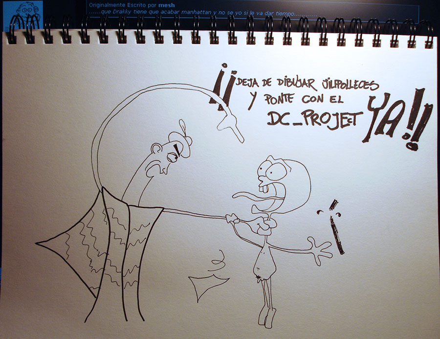 08:15 de la mañana, en el trabajo en sábado. entrega crítica el 10 de nov. Luz roja de peligro encendida. Entro en la oficina. Todo oscuro. Enciendo plotters y ordenadores. Los fluorescentes, su zumbido. Solo. Soy un maldito, un desgraciado: podría estar durmiendo con mi mujercita en lugar de aquí. Enciendo mi ordenador. Reviso el correo. Desmoralización. Entro en 3dpoder mientras se hace el café. Veo los bocetos de Drakky y me sacan una sonrisa. Son graciosos y cachondos. Me alegran el comienzo de la tarea. Gracias Drakky.