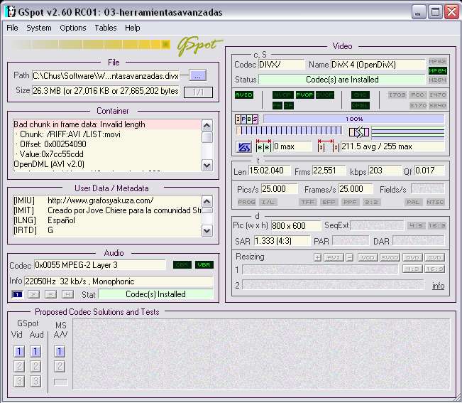 Por cierto Shazam: Podrías bajarte este programa y decirme si te da algún mensaje de error en los códecsí sobre todo si te dice arriba a la derecha lo de códec(s) are installed (si pones una captura de la pantalla que te sale, mejor aun). http://Gspot, headbands.com/.