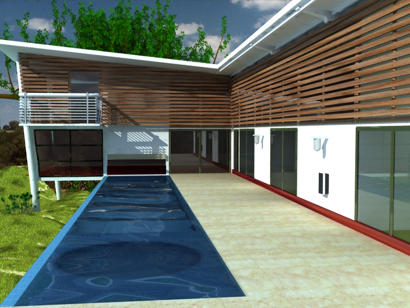 Se ve bastante bien para ser un primer render en Vray, hay algunas cosas que no se ven muy bien, como, por ejemplo, el piso de madera es muy madera natural, me explico: esta muy no elegante como para el diseño, la palmera del fondo no se le viene mucho como adorno y el agua se podría mejorar.