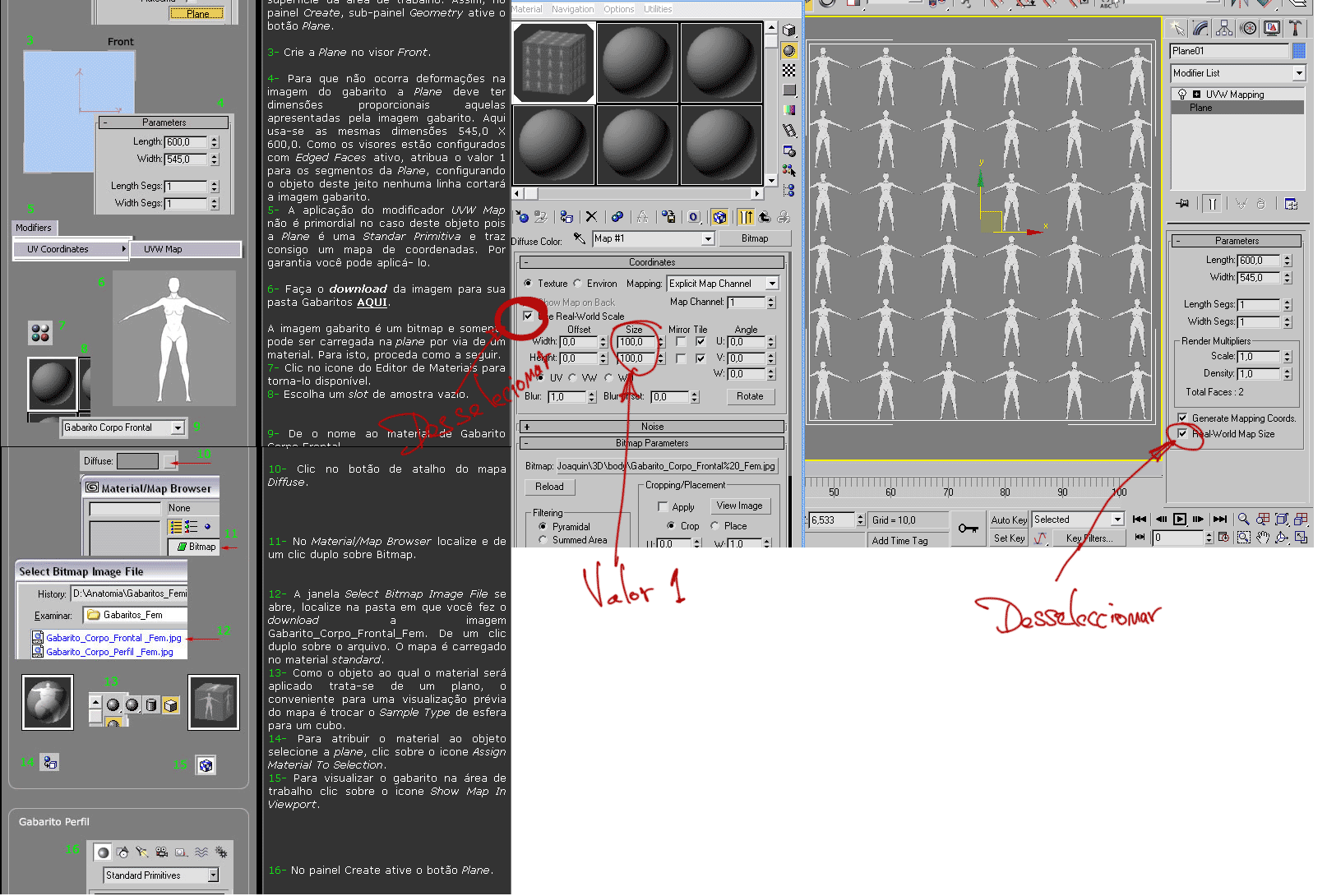 Por último, y también como pista te sugiero que observes los resultados obtenidos con distintos valores y como estos afectan al display gráfico tanto en los visores de 3ds Max como en el visor de materiales. tip: intenta sacar conclusiones entre los resultados y los valores tipeados tanto en las medidas del plano como en los introducidos en el visor de materiales en el contador size. Saludos.