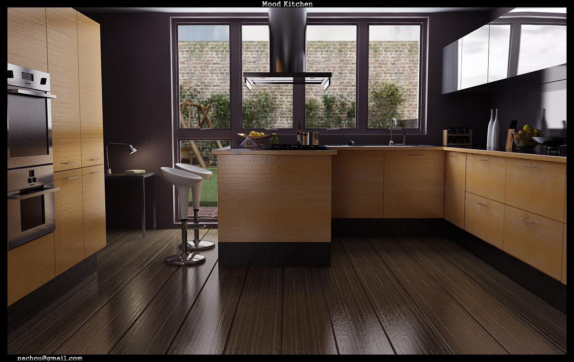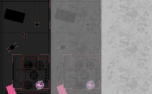 La escena tiene pocos mapas, salvo los bumps mencionados para la madera, un mapa para las reflexiones de la mesada, la cual le tiré un printscren para poder ubicar los rayones a gusto.