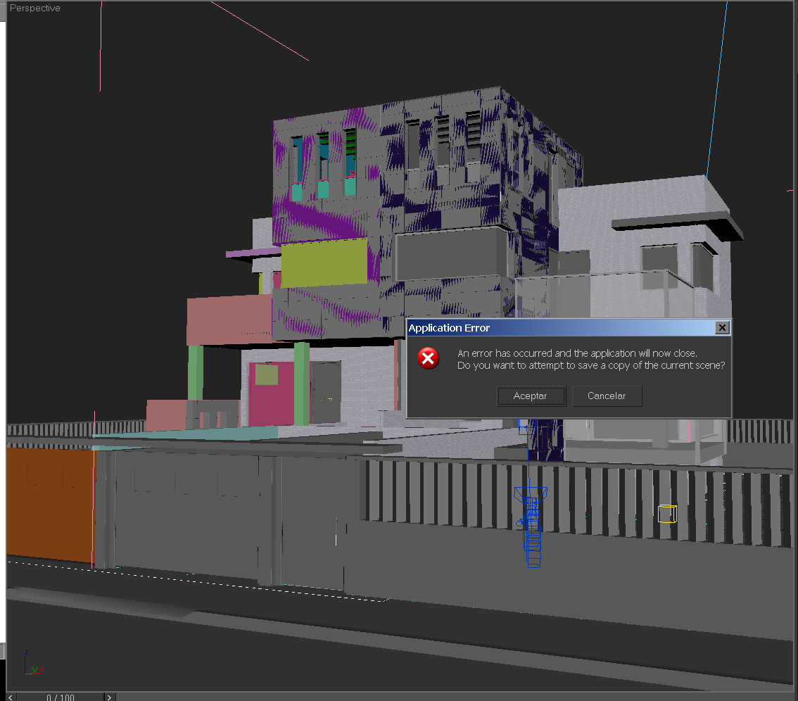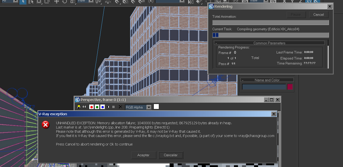 Hola a todos, pues resulta que hago un trabajo este verano, lo término entrego los renders y ahora me dicen que quieren unos cambios, bueno los término y cuando voy a sacar las imágenes me da el siguiente error y se me apaga el max, he probado a borrar coches árboles farolas maceteros etc para que la escena se quede limpia y no chupe memoria paro aun así me da el error, es una escena simple, las texturas tienen un tamaño pequeño, todos los elementos que se repiten en cantidad son Vray proxy, bueno os dejo una imagen del error a ver si a alguien le a pasado lo mismo. Gracias.