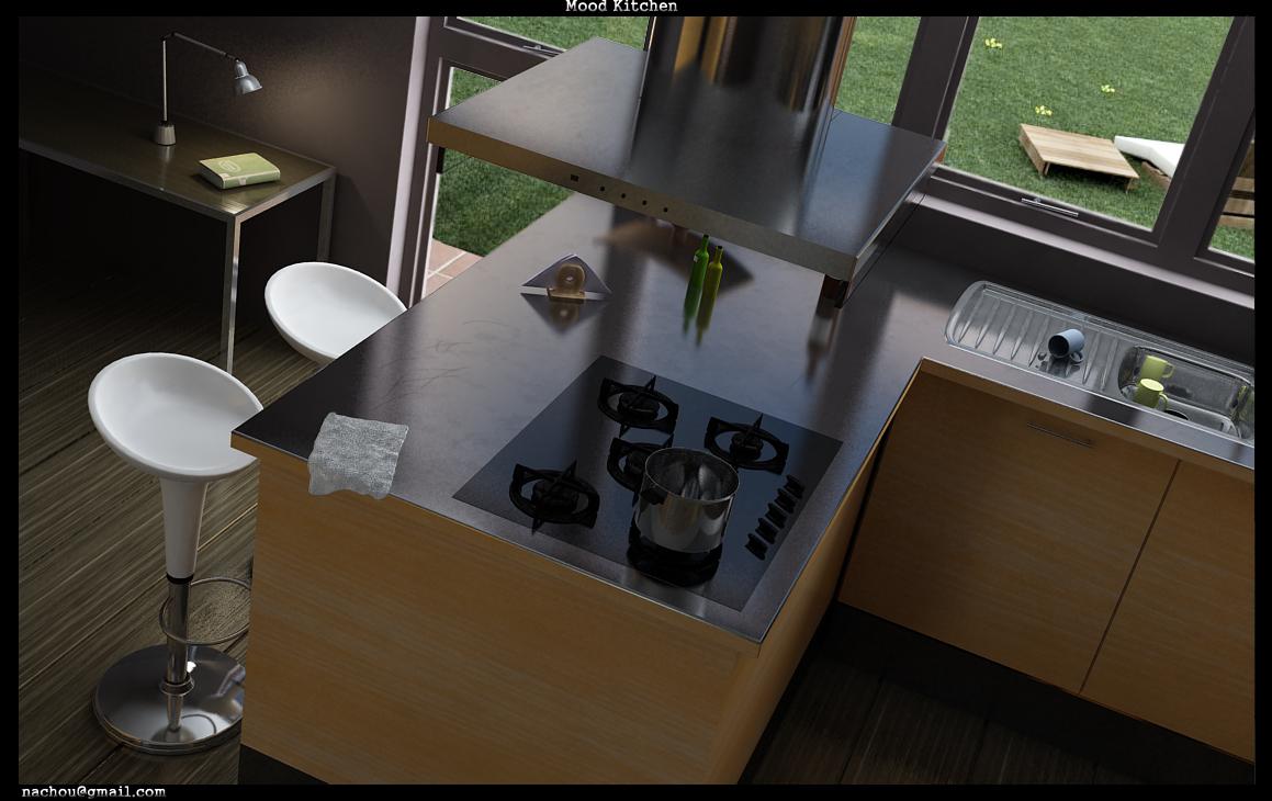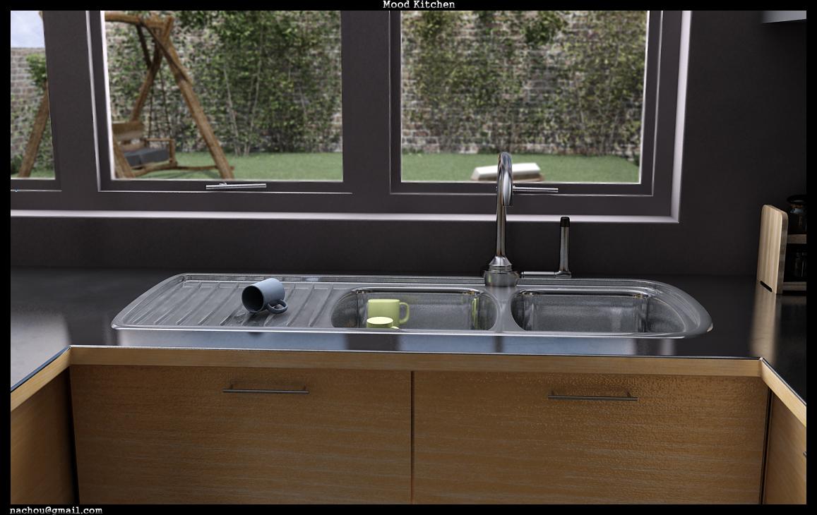 La escena tiene pocos mapas, salvo los bumps mencionados para la madera, un mapa para las reflexiones de la mesada, la cual le tiré un printscren para poder ubicar los rayones a gusto.