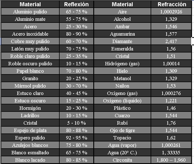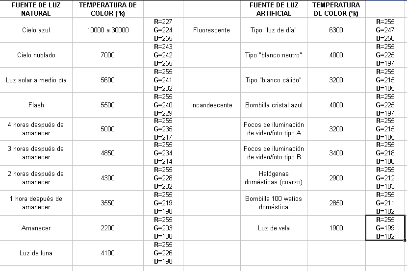 Pensé que ya había subido este archivo, pero no. Y es bastante útil, sobre todo para los que empiezan. Son excels con temperaturas de color y reflexiones y refracciones de según qué material.