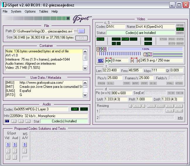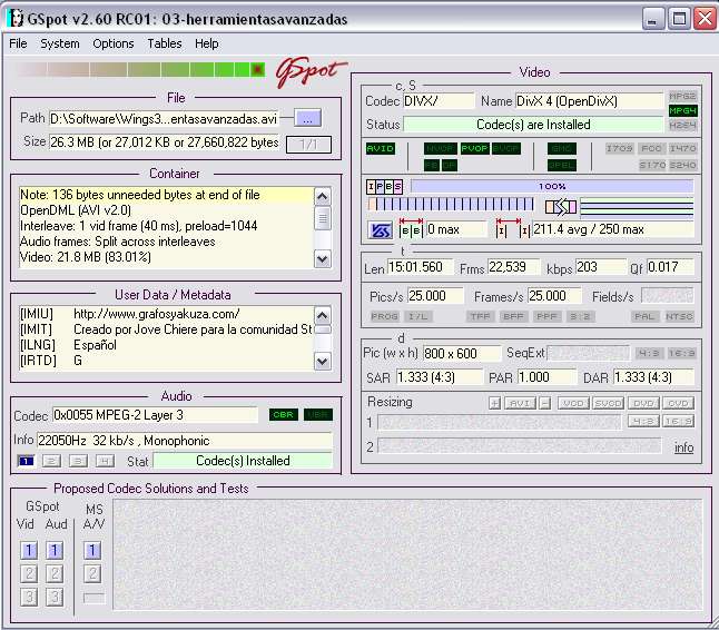Por cierto Shazam: Podrías bajarte este programa y decirme si te da algún mensaje de error en los códecsí sobre todo si te dice arriba a la derecha lo de códec(s) are installed (si pones una captura de la pantalla que te sale, mejor aun). http://Gspot, headbands.com/.