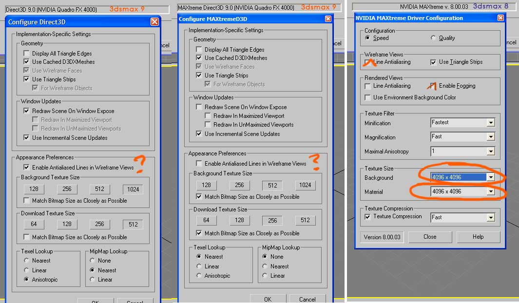 He actualizado los drivers de mi Quadro para verificar mejor los Maxtreme, luego he cogido una escena de peso con 7 millones de polígonos, y en el modo alámbrico los frames por segundo que me dan en DirectX son 2,5 y en Maxtreme 3. En los demás modos los frames son muy similares, siendo los de Maxtreme ligeramente superiores, como 3 o 4 frames nada más. La diferencia entre el sombreado vs alámbrico es abismal, me salen 1000+ frames por segundo (se mueve muy suave). Creo que algo me está fallando.